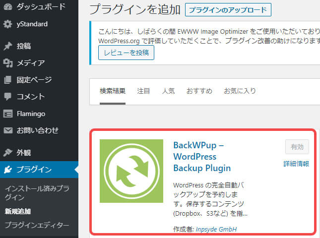 管理画面のプラグイン欄の新規追加からBackWPupを検索して、今すぐインストール→有効化にします。