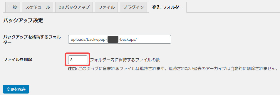 ファイルを削除…今回の設定では自動バックアップをサーバーに保存する為、事前にバックアップ数の上限を決めないと容量が埋まってしまいします。投稿頻度や自動バックアップの頻度によって変えていくといいです。今回は毎週1回バックアップの設定なので、とりあえず最新2か月分のバックアップを保存することにしました。