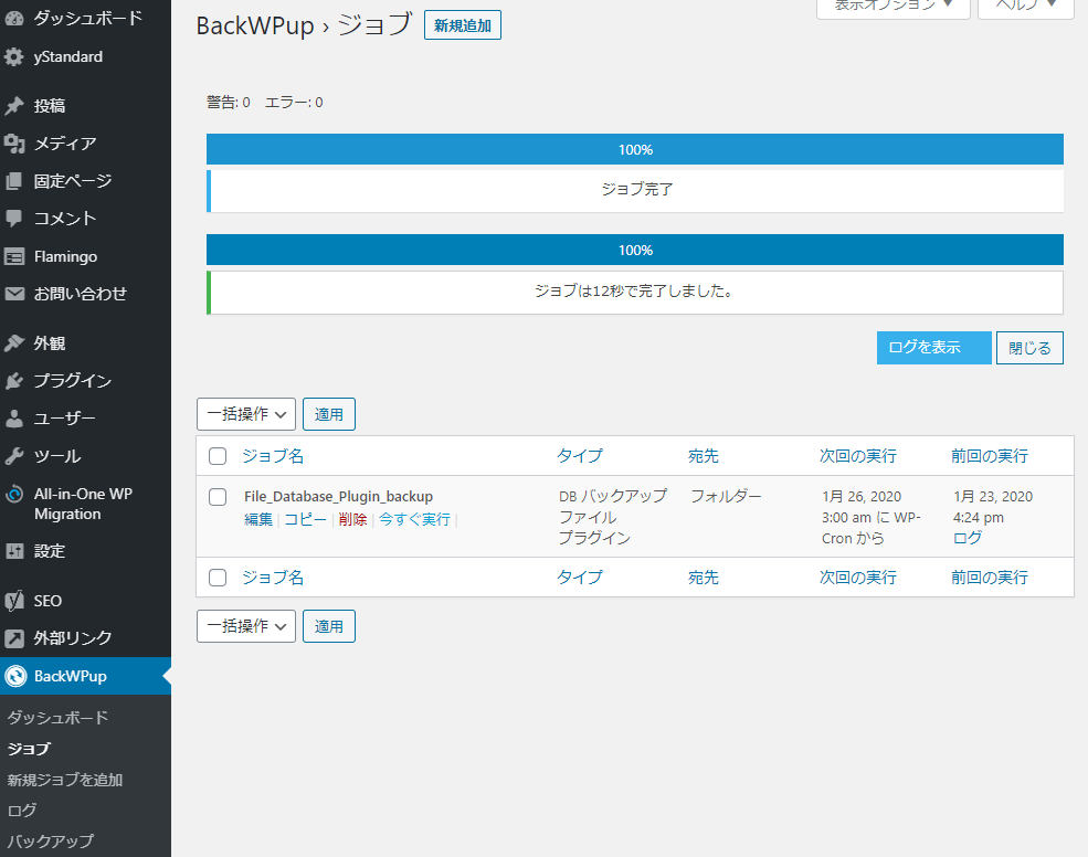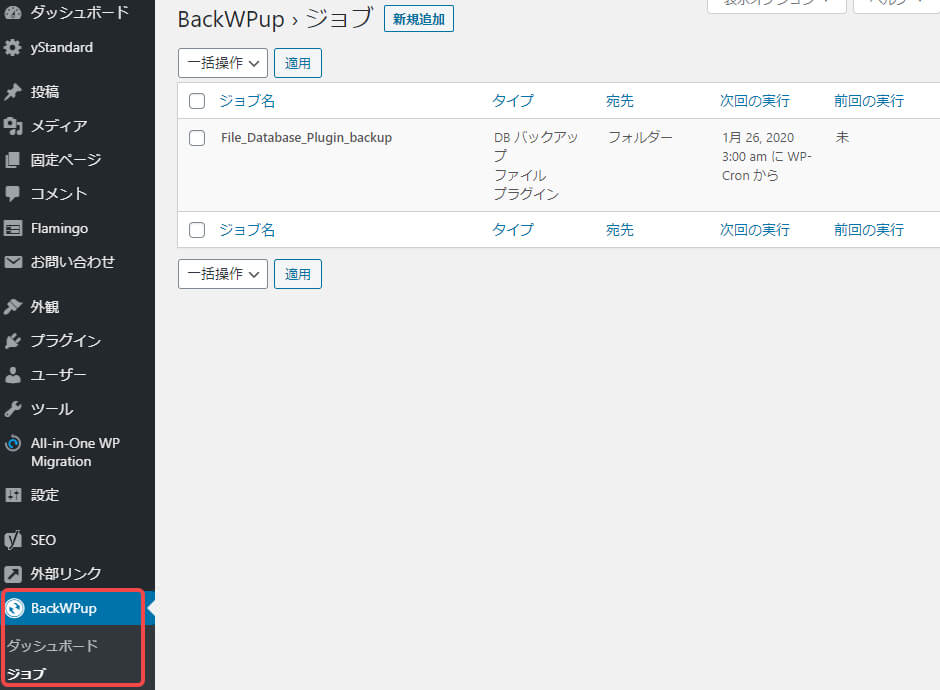 管理画面のBackWPupのジョブメニューにある、作成したジョブ名にカーソルを合わせると、『今すぐ実行』が表示されるのでクリックすると、すぐにバックアップをとってくれます。